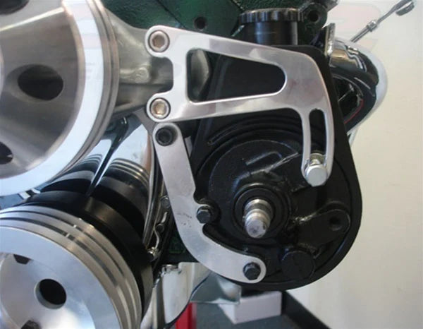 Chevy chrome plated billet aluminum power steering bracket set fits 1963-1987 Chevy 283-305-327-350 small block engines and comes with complete mounting hardware.