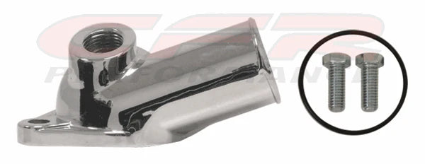 Zinc alloy Chevy small block 283-305-327-350 & big block 396-402-427-454 V8 chrome thermostat housing water neck with 1/2" NPT port. Two stainless steel bolts and O-ring gasket included.