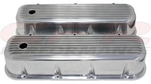 Chevy big block finned polished aluminum valve covers fit 1965-95 Chevy 396-427-454-502 big block engines. Comes with two oil baffles and stainless steel bolt kit. There is one breather hole in each cover. They are the tall style to clear high performance roller rockers.